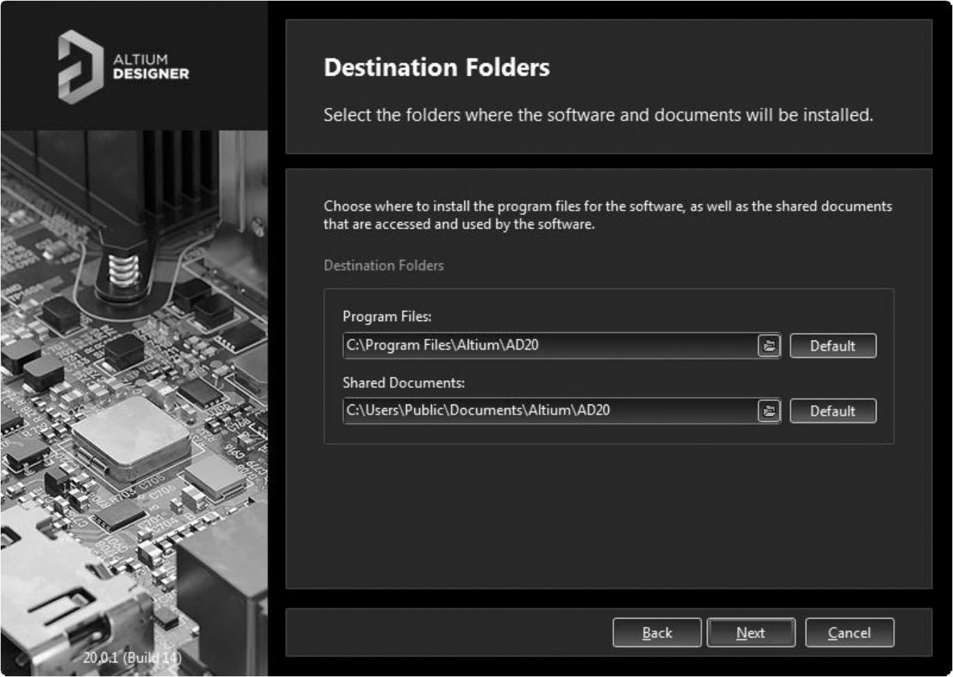 第4步:选择好安装类型后,单击“Next”按钮,进入安装路径对话框,如图1-4所示。在安装路径对话框中,用户需要选择Altium Designer 20的安装路径。系统默认的安装路径为C:\Program Files\ Altium Designer 20\,用户可以通过单击“Browse”按钮来自定义安装路径。