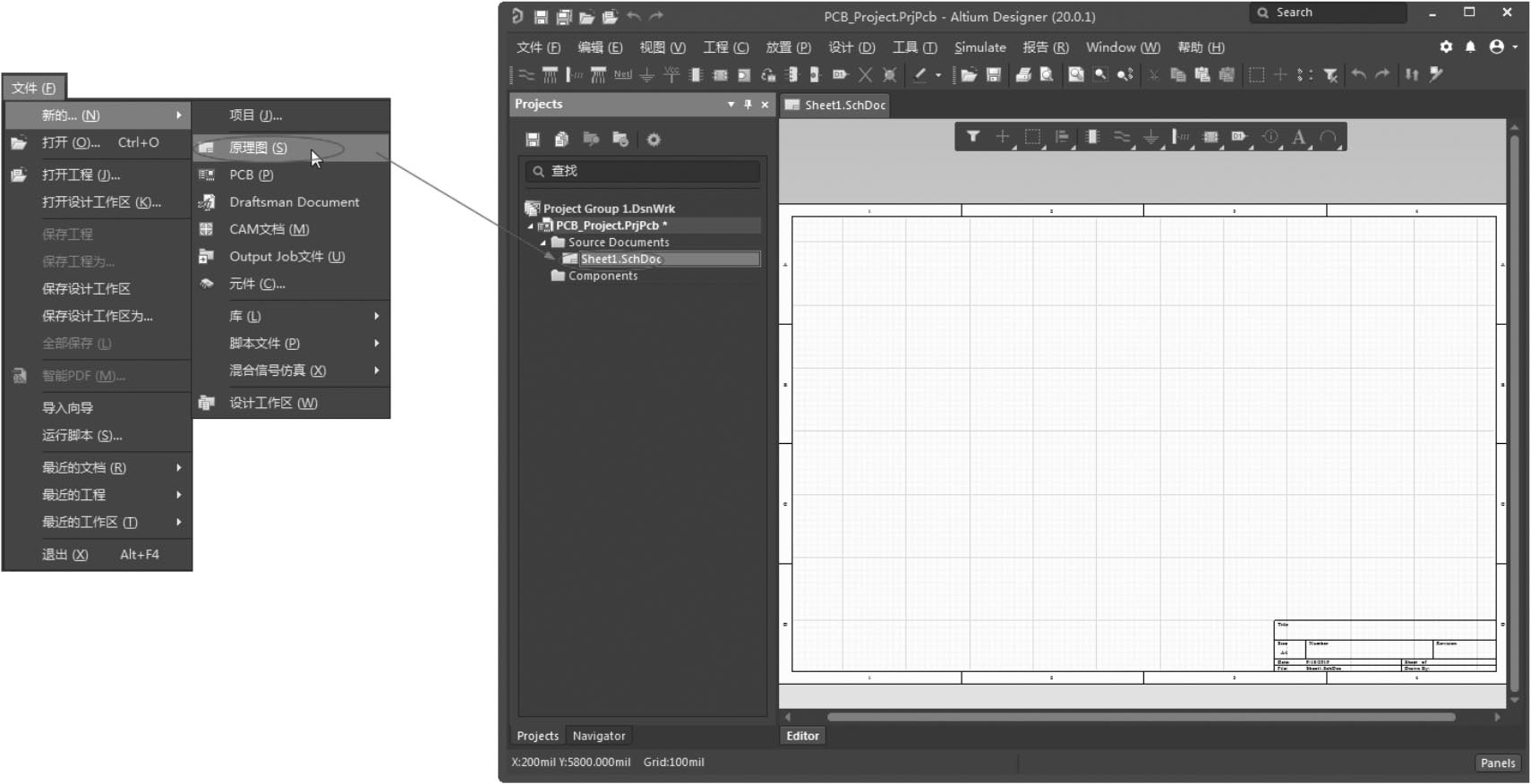 选择“原理图”命令,在当前工程PCB-Project1.PrjPcb下建立电路原理图文件,系统默认文件名为Sheetl.SchDoc,同时在右边的设计窗口中将打开Sheetl.SchDoc的电路原理图编辑窗口。新建的电路原理图文件如图2-4所示。