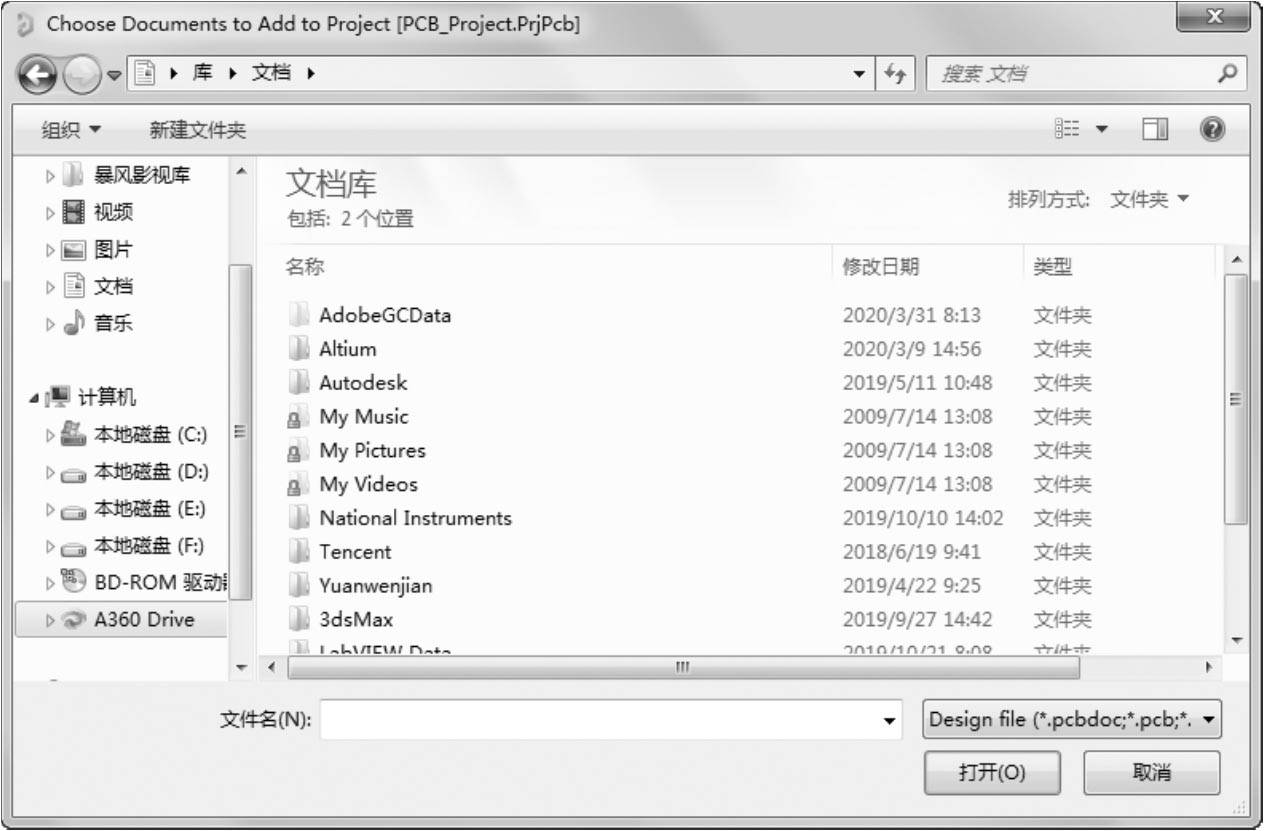 在工程文件处右击,弹出快捷菜单,选择“添加已有文档到工程”命令,即可打开电路原理图文件,如图2-8所示。