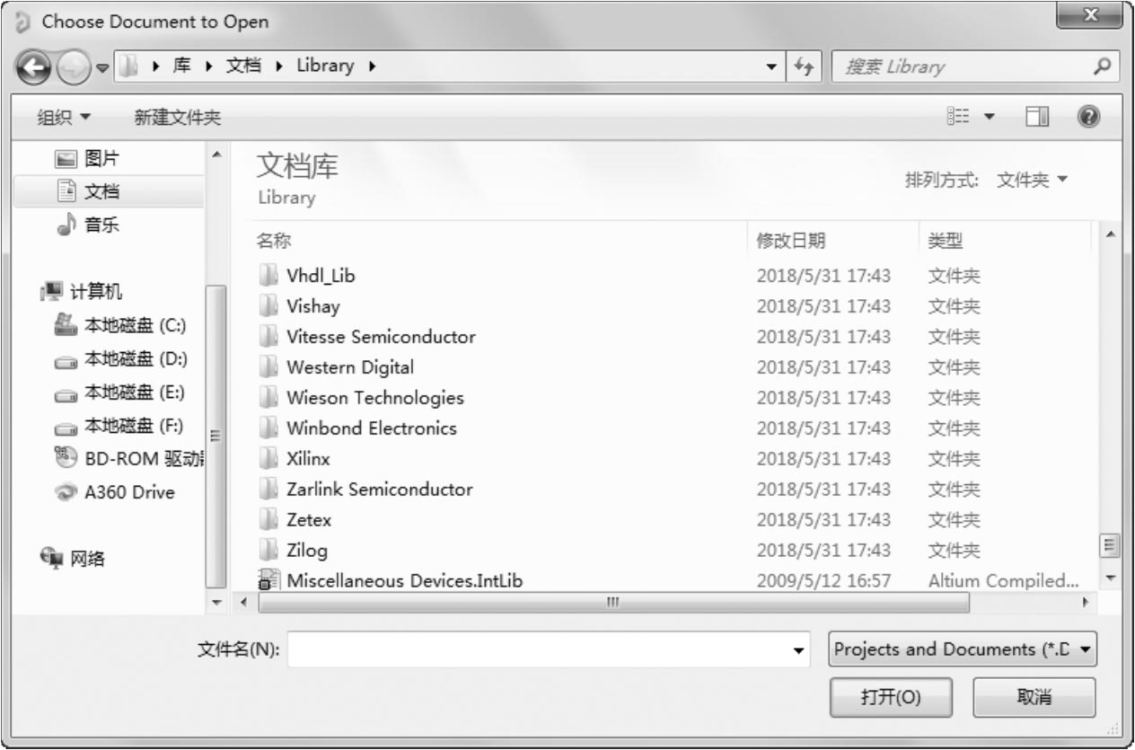 依次选择菜单栏中的“文件”→“打开”命令,打开如图2-7所示的对话框,在该对话框中选择将要打开的电路原理图文件或其他类型的文件,并将其打开。
