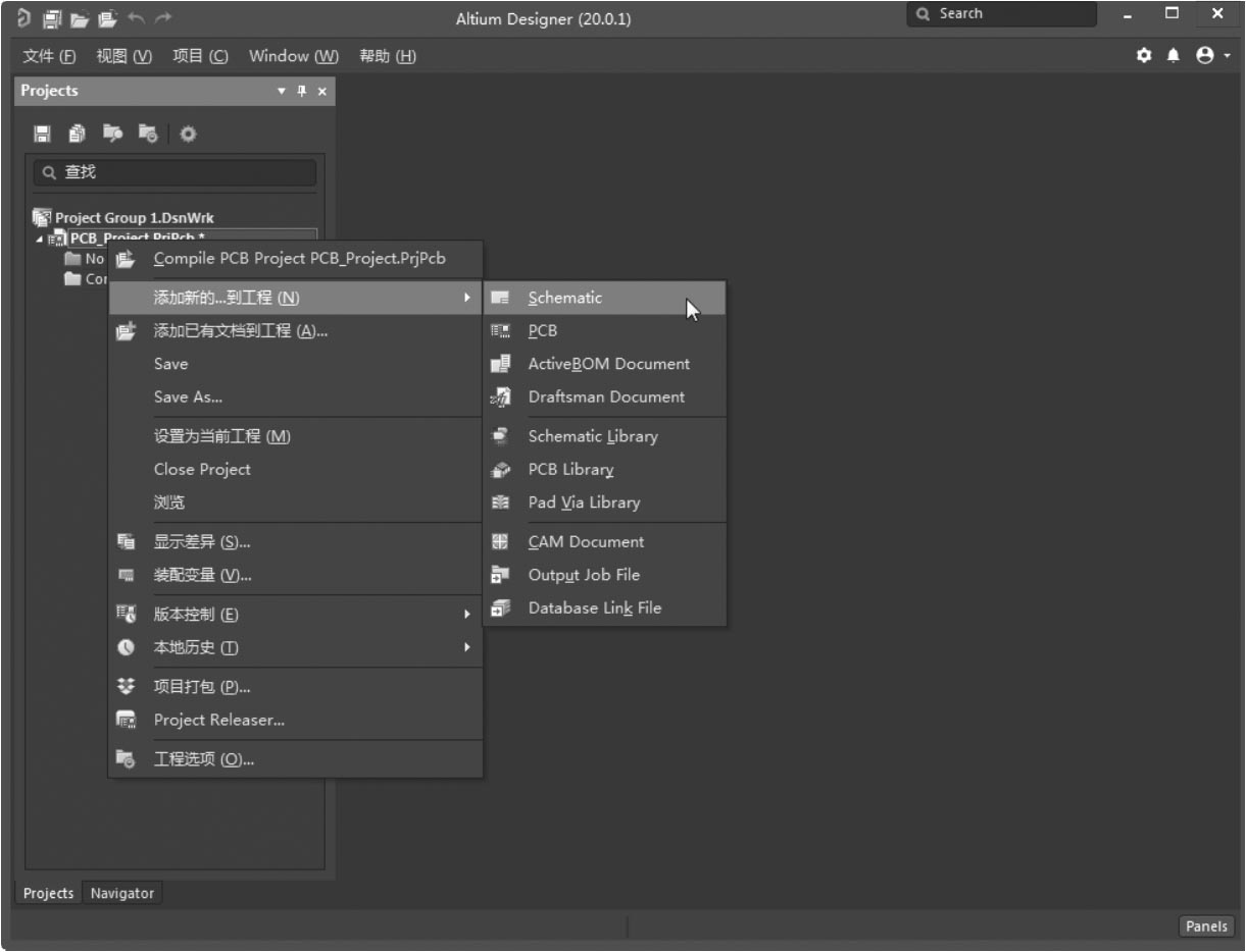 在新建的工程文件处右击,弹出快捷菜单,依次选择“添加新的…到工程”→“Schematic”命令,即可创建电路原理图文件,如图2-5所示。