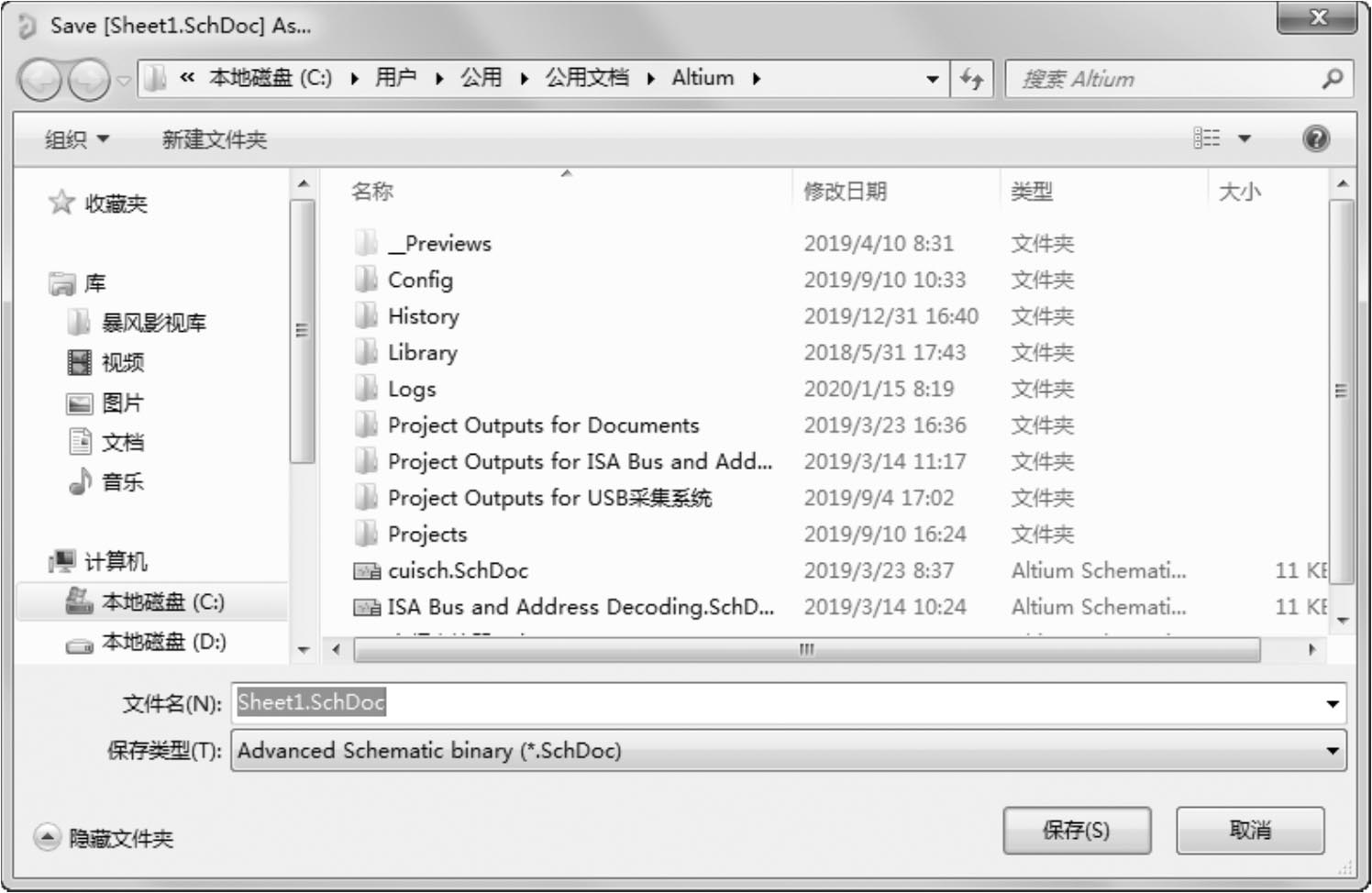 依次选择菜单栏中的“文件”→“另存为”命令,打开如图2-6所示的保存电路原理图文件对话框。