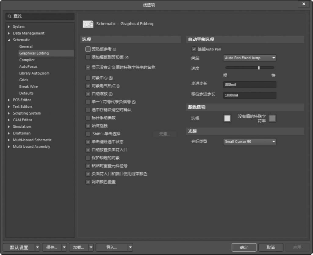 依次选择菜单栏中的“工具”→“原理图优先项”命令,或者在电路原理图图纸上右击,弹出快捷菜单,选择“原理图优先项”命令,打开“优选项”对话框。在“优选项”对话框中选择Graphical Editing(图形编辑)选项,打开图形编辑界面,如图2-37所示。