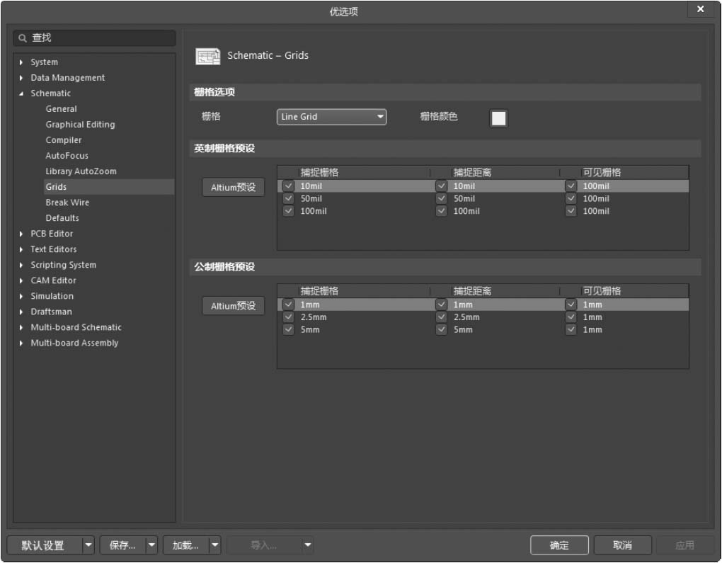 Altium Designer 20提供了两种栅格形状,即Lines Grid(线状栅格)和Dots Grid(点状栅格),如图2-35所示。