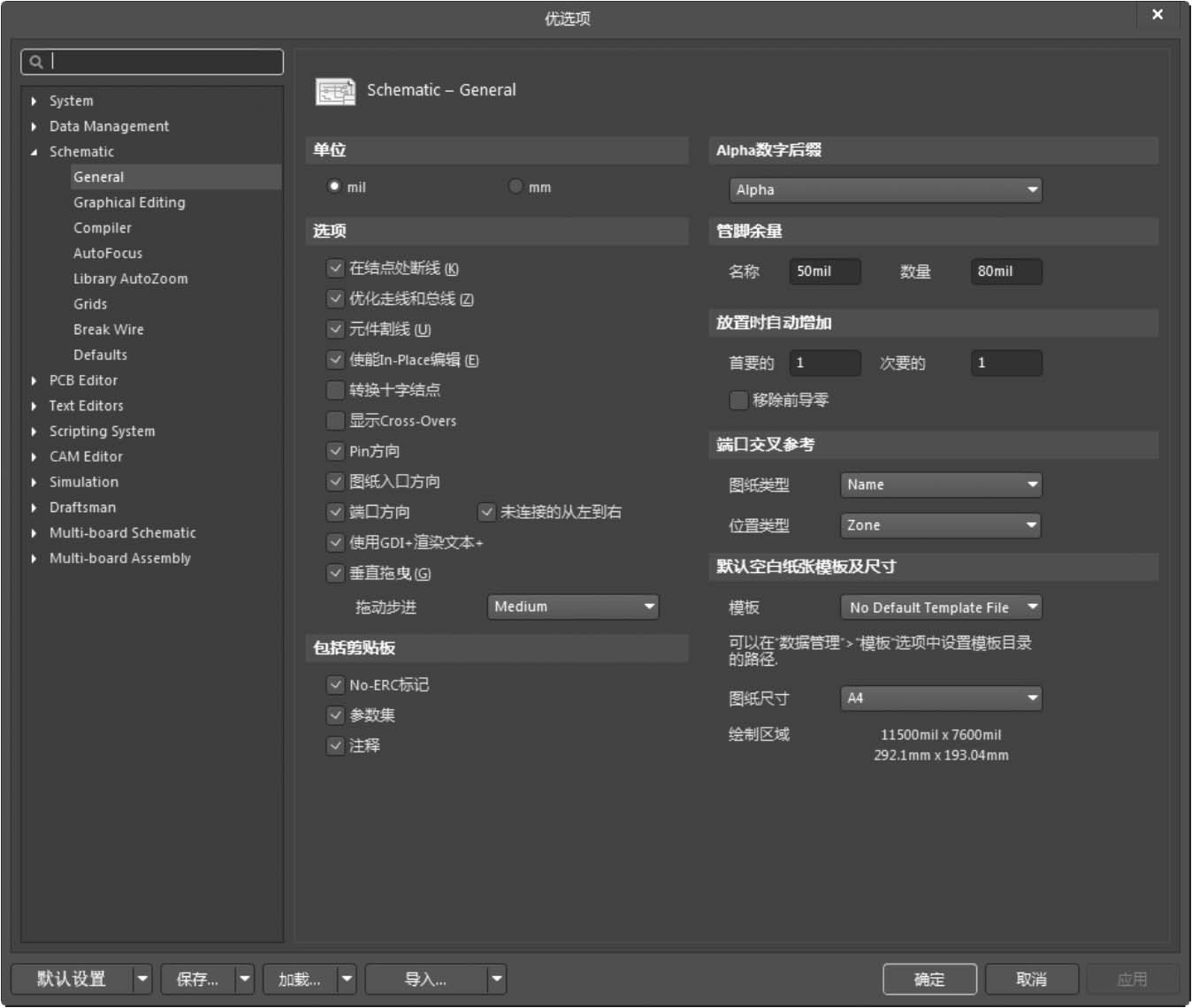 “优选项”对话框中有8个选项卡:General(常规设置)、Graphical Editing(图形编辑)、Compiler(编译器)、AutoFocus(自动获得焦点)、Library AutoZoom(库扩充方式)、Grids(栅格)、Break Wire(断开连线)和Default(默认)。下面对这些选项卡进行具体介绍。