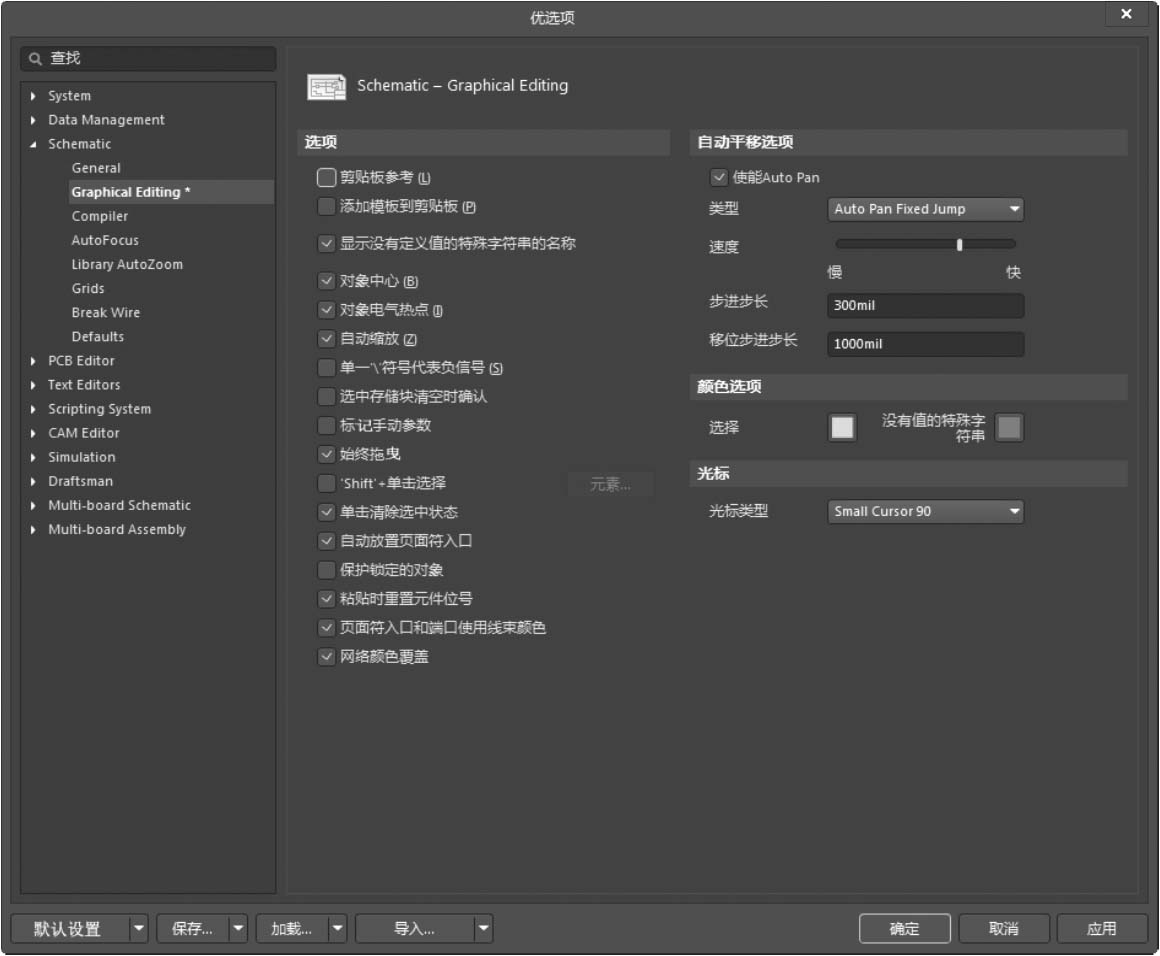 该选项组主要用于设置系统的自动摇镜功能,即当光标在栅格原理图上移动时,系统会自动移动电路原理图,以保证光标指向的位置进入可视区域。