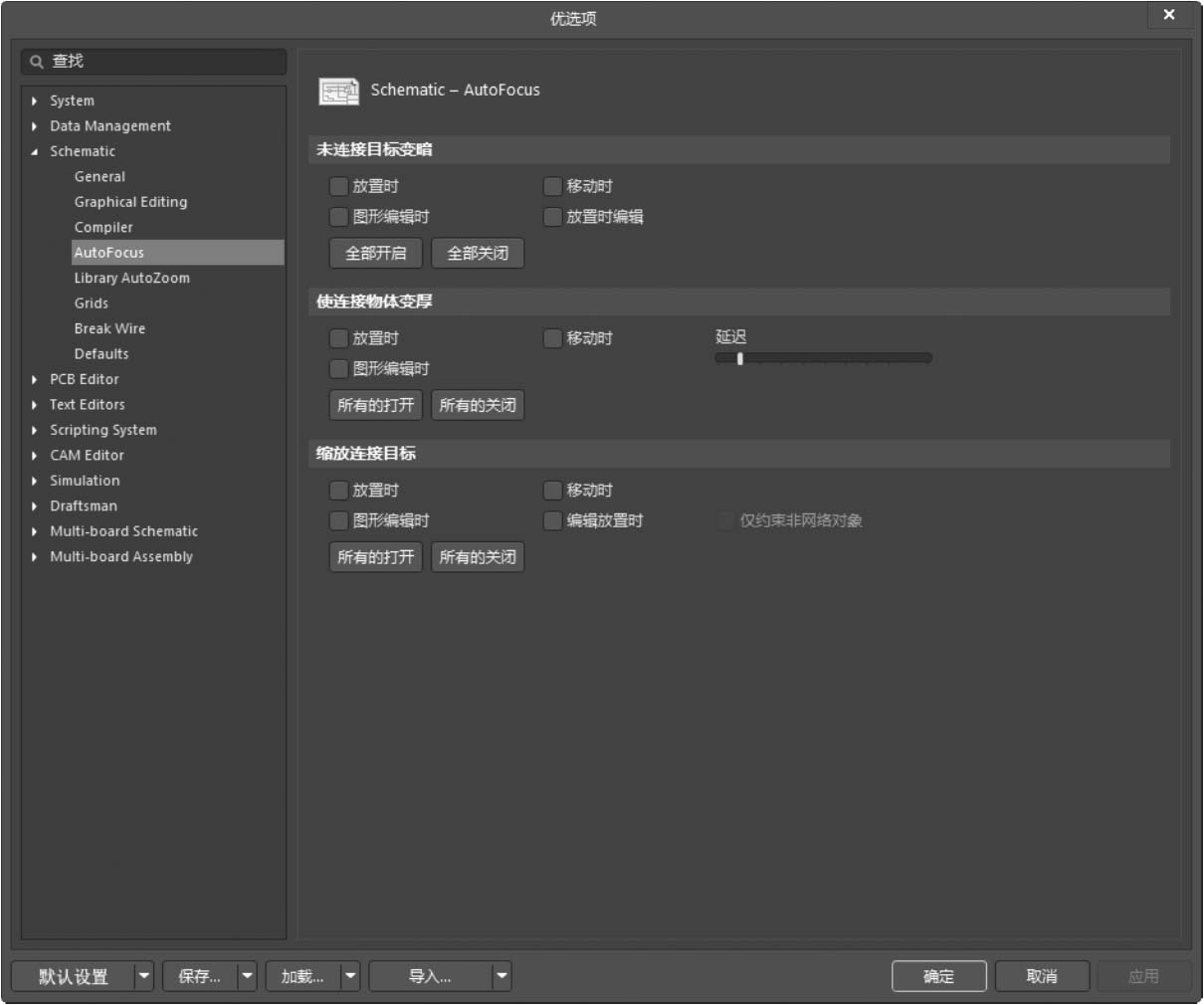 AutoFocus选项卡主要用来设置系统的自动聚焦功能,此功能可以根据电路原理图中的元器件或对象所处的状态进行相应的显示。