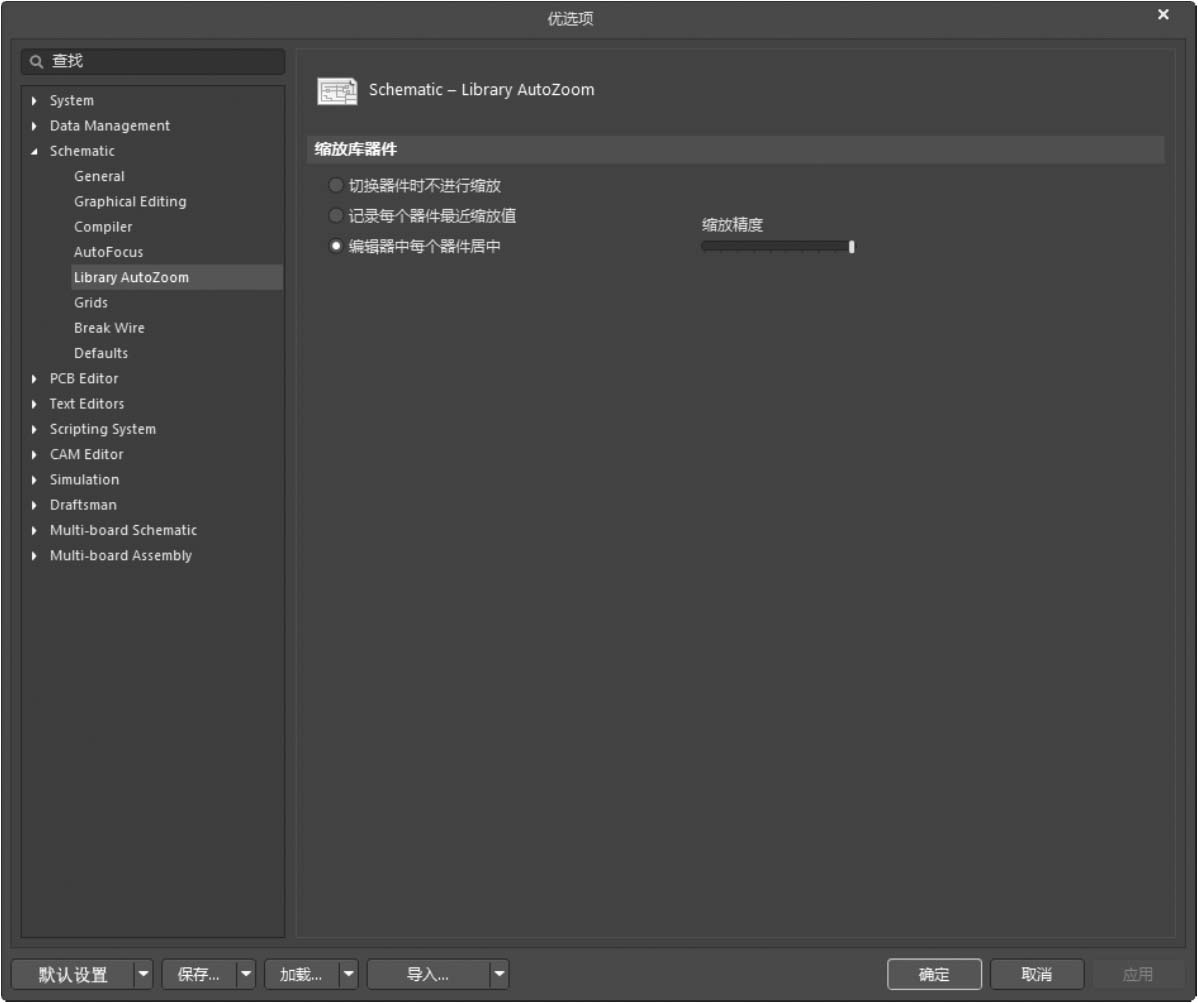 Library AutoZoom选项卡中有3个单选按钮,分别是“切换器件时不进行缩放”、“记录每个器件最近缩放值”和“编辑器中每个器件居中”。用户根据自己的实际需要选择即可,系统默认选中“编辑器中每个器件居中”单选按钮。 /6p4gU0KoLy1Ib2hUZ/KDQ1JrQntMNCmSiXIsBSO75xGWek0p6cfHxcmrKayIIzx