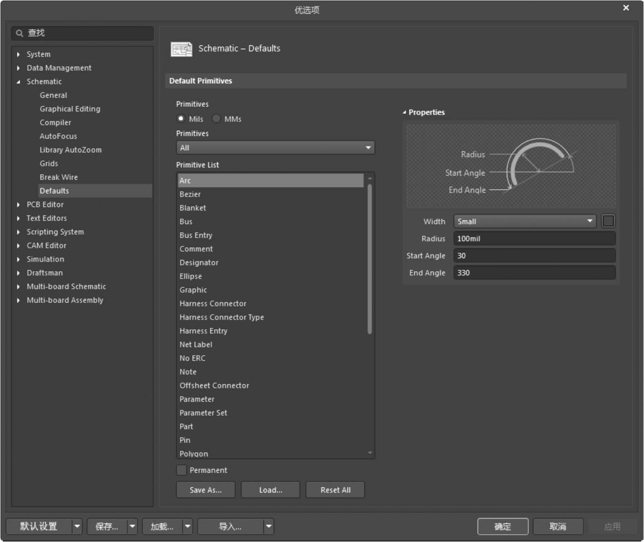 在“优选项”对话框中,单击“Default”(默认值)选项,弹出Default选项卡,如图2-53所示。Default选项卡用来设置使用英制单位系统或公制单位系统绘制电路原理图。