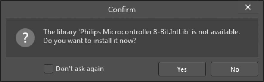 选中需要的元器件(不在系统当前可用的库文件中)并右击,弹出快捷菜单,选择“放置元器件”命令,系统弹出如图3-7所示的是否加载库文件提示框。若单击“Yes”按钮,则元器件所在的库文件被加载;若单击“No”按钮,则只使用该元器件而不加载其所属元器件库。