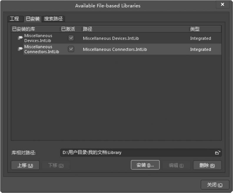 按钮,弹出快捷菜单,选择“File-based Libraries Preferences”(库文件参数)命令,系统将弹出“Available File-based Libraries”(可用库文件)对话框,如图3-5所示。该对话框中有3个选项卡:“工程”选项卡,列出的是用户为当前设计项目创建的库文件;“已安装”选项卡,列出的是当前安装的系统库文件;“搜索路径”选项卡,列出的是查找路径。