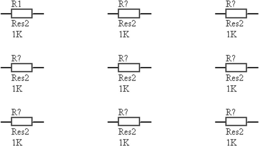 首先,在每次使用阵列式粘贴功能前,必须通过复制操作将选取的元器件复制到剪贴板中。然后,执行阵列式粘贴命令,设置“智能粘贴”对话框,这样就可以实现选定元器件的阵列式粘贴。图3-22为一组3×3的阵列式粘贴电阻。