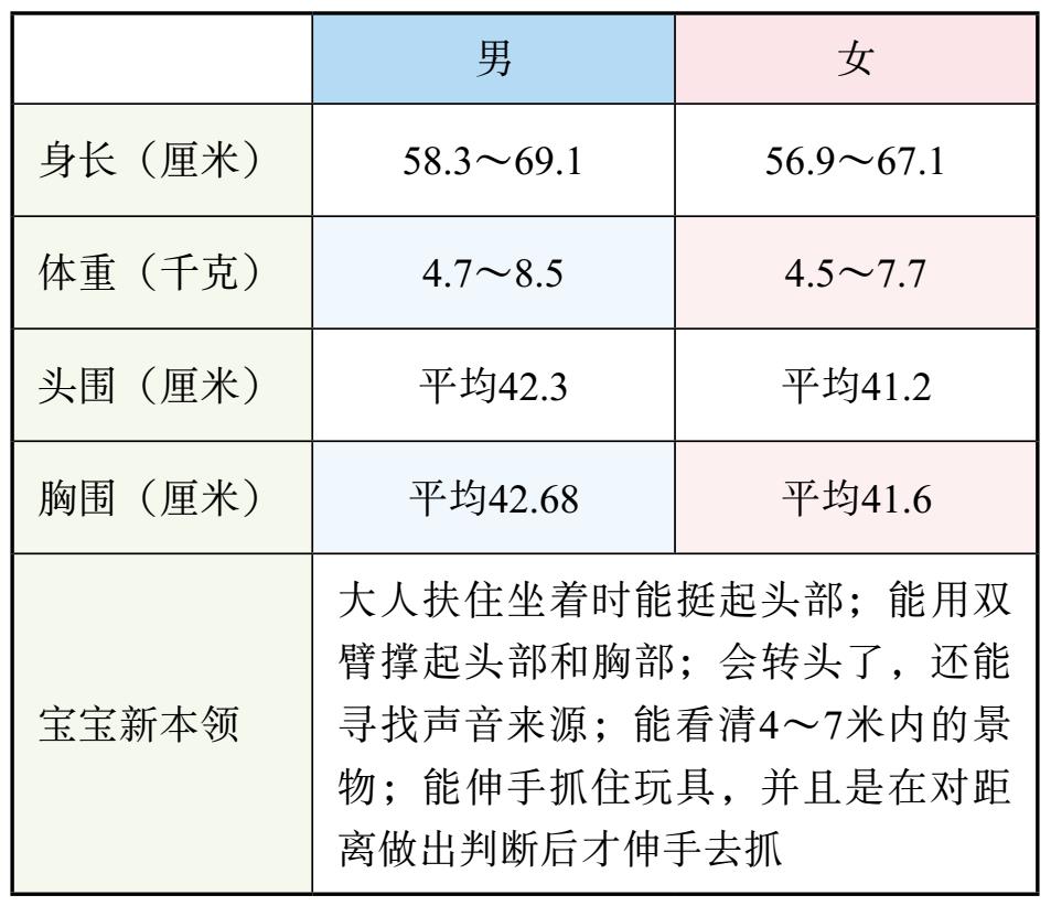 这时宝宝的体重可达到出生时的两倍,胸围和头部一样粗,身长也比出生时长了10厘米以上。以后,体重和身长的增长速度开始减慢。但每个宝宝都不一样,没必要跟别的宝宝做比较。只要宝宝活泼有力,就说明很健康,不用过于担心。