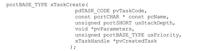 在FreeRTOS中,任务的创建和删除分别采用xTaskCreate函数和vTaskDelete函数。其中, xTaskCreate函数的原型如下: