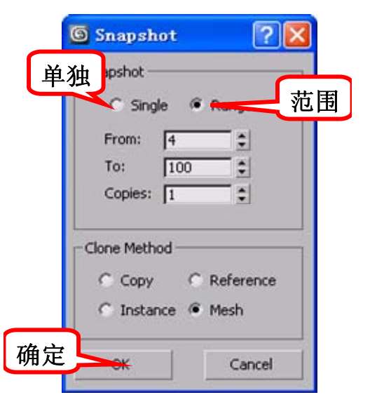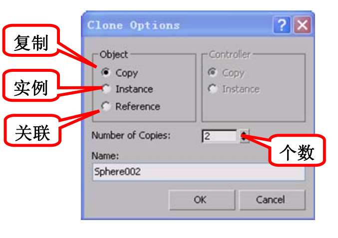 从复制对话框可以看出,复制物体时有三种选择,即:Copy(复制)、Instance(实例)、Reference(参考),如图2-30所示。