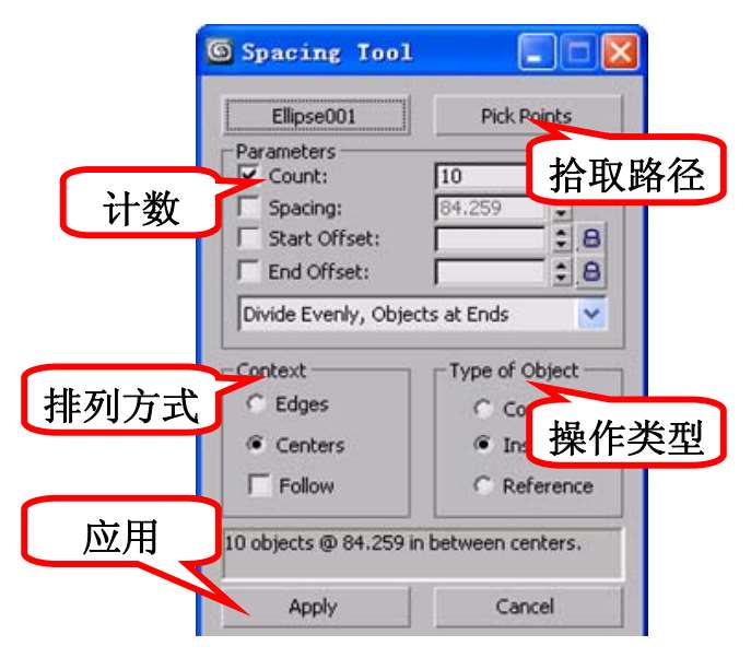 3选择球体,选择菜单栏中的Tools(工具)→Align(对齐)→Spacing Tool(间隔对齐)命令,弹出Spacing Tool(克隆并对齐)对话框,如图2-35所示。