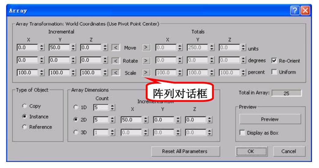 2选择球体,选择菜单栏中的Tools(工具)→Array(阵列)命令,弹出Array阵列对话框,如图2-33所示。