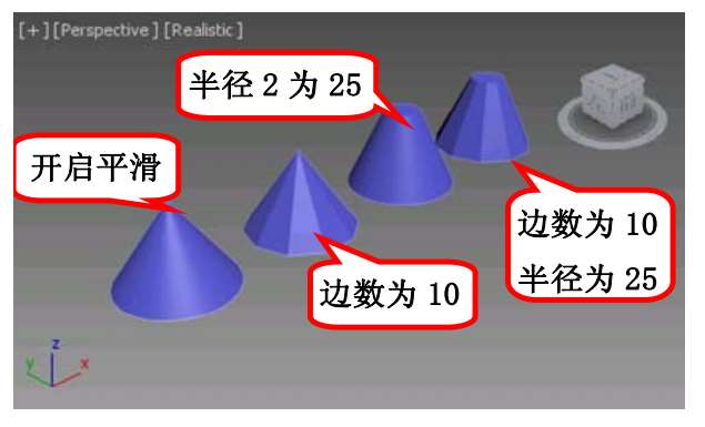 此时,可以在Perspective(透)视图中看到圆锥体采用不同参数时的形状变化,如图3-11所示。