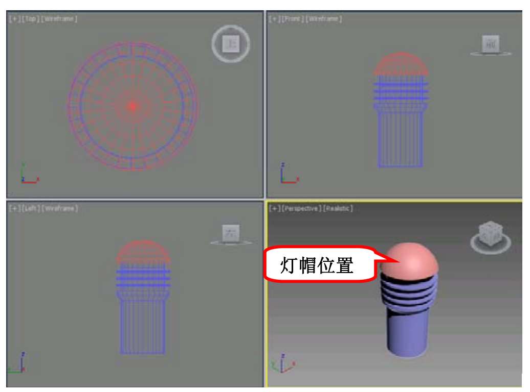 10单击创建命令面板中的Sphere(球体)按钮,在Top(顶)视图中创建球体,命名为“灯帽”,其参数设置如图3-29所示。