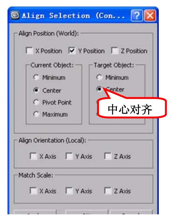 ,在Front(前)视图中单击“灯柱”,在弹出的Align Selection(对齐选择)对话框中进行设置,如图3-25所示。此时灯具效果如图3-26所示。