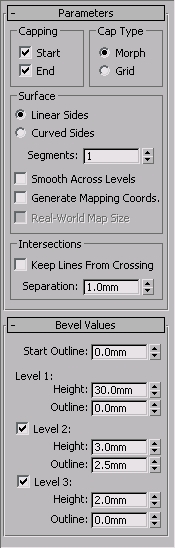 3 单击Modify(修改)命令面板中的下拉列表中选择Bevel(倒角)命令,并设置Parameters(参数)卷展栏中的参数,如图3-23所示。