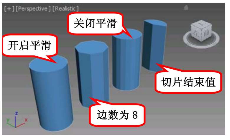 对圆柱体来说,除一般的参数之外,经常会用到如下的参数:Smooth(光滑)、Side(边数)、Slice on(切开)。下面举例介绍。