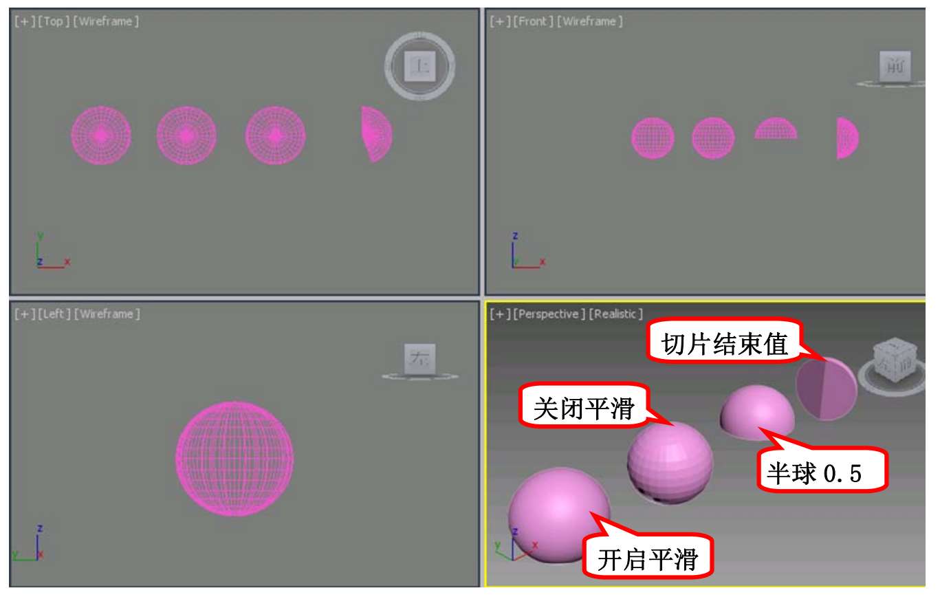 对球体而言,经常会用到如下的参数: Smooth(光滑)、Hemisphere(半球)、Slice on(切开)。下面举例介绍。
