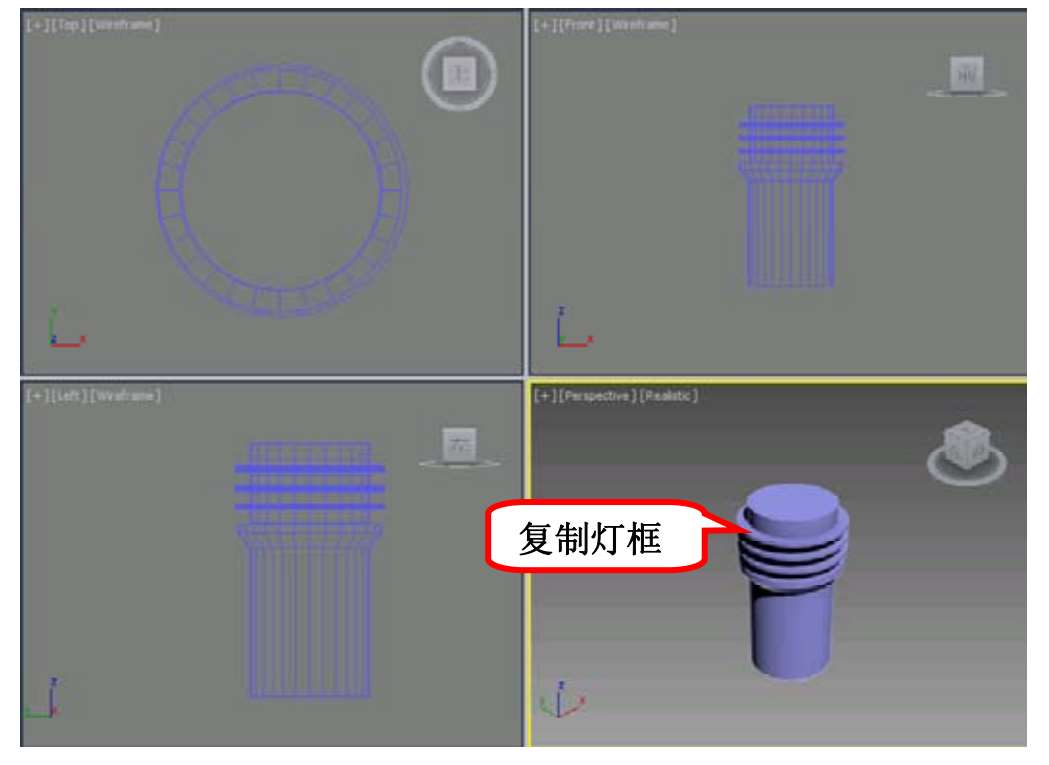 轴向上移动“灯罩”。在弹出的Clone Options(克隆选项)对话框中,将其命名为“灯框”。