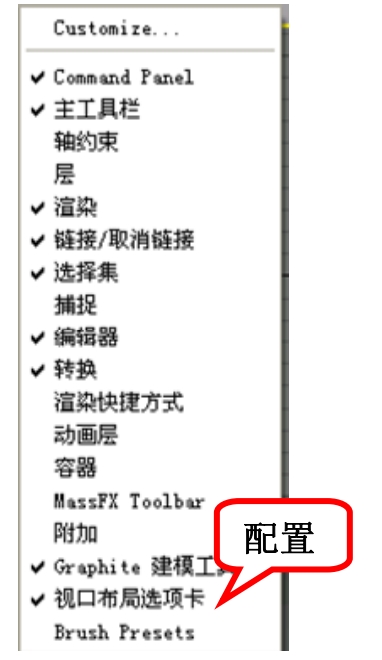 默认情况下3ds Max 2013中只显示主工具栏。主工具栏中的工具图标按钮包括选择类图标,选择与操作类图标,连接关系类图标复制、视图类图标,捕捉类图标和其他工具图标。当前选中的工具按钮呈黄底显示。要打开其他的工具栏可以在工具栏上单击鼠标右键,在弹出快捷菜单中选择或配置要显示的工具项和标签工具条,如图1-9所示。