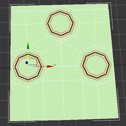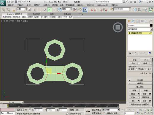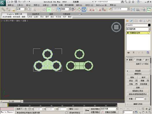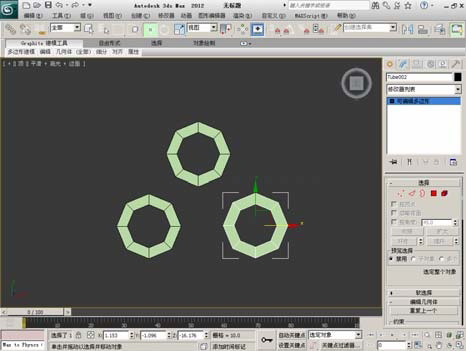 02 将环形面片模型塌陷成可编辑多边形,然后对其进行复制操作,复制出两个相同的模型,一个位于原始模型的旁边,另一个位于原始模型的上部。将三个均匀的放置于场景空间。如图4.2所示。