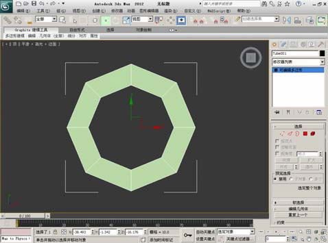 01 在顶视图中,创建一个环形面片模型。现在不用考虑是否对其使用缩放命令,因为这只是个练习。设置内部半径为8,外部半径为12,将边数设置为8。如图4.1所示。