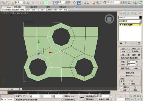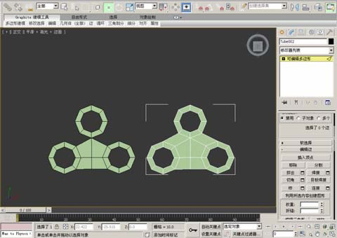 命令合并其他两个模型,这样三个元素就成为可编辑多边形中的一部分。完成这一步骤后,接下来就在三个模型之间进行桥接操作。因为每个面片模型都具有相同数目的边,所以桥接操作就变得很简单。
