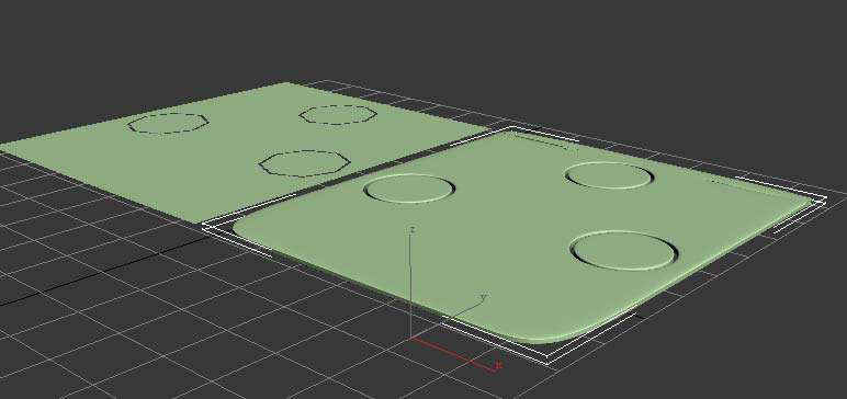 04 在修改命令面板中单击轮廓线命令的参数设置按钮,将参数设置为一个负值,以产生类似于图4.18所示的效果。在最后几个步骤中,我们从现有的模型(面板)上生成具有高精度的新的几何体(键或按钮)。在这个过程中最让人高兴的是这些新生成的模型可以很容易的被编辑、分离、测量、甚至细化,或者以各种方式进行改变。