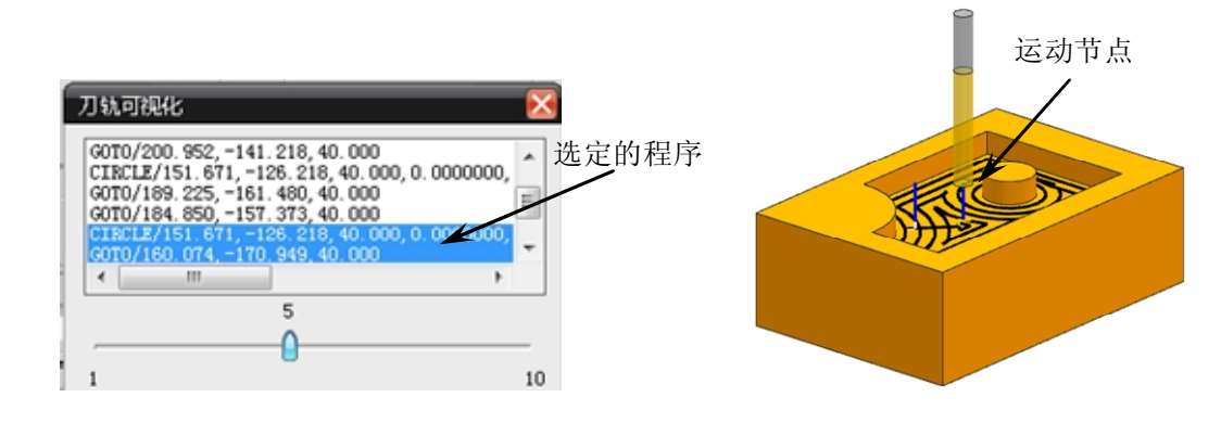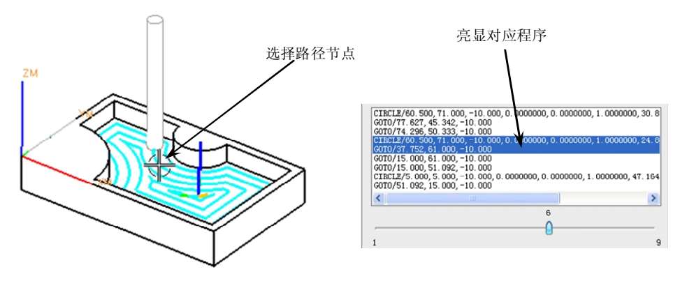 当在程序列表框中选定某段程序时,图形区的刀具则在该加工节点处显示。当在图形区中选择某一节点路径,则在程序列表框中亮显对应程序,如图1-123所示。