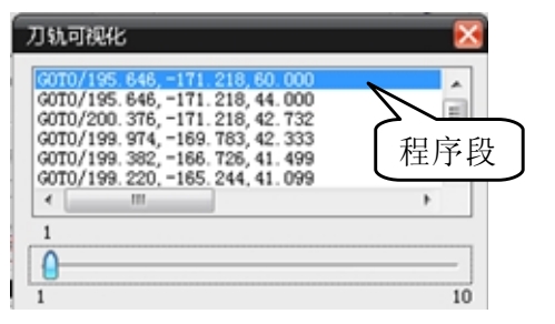对话框上部的列表框显示的是加工程序列。程序段节点滑动条控制加工程序列中程序段的显示,例如拖动到2,则程序列表中将显示第2个程序段的程序,如图1-121所示。