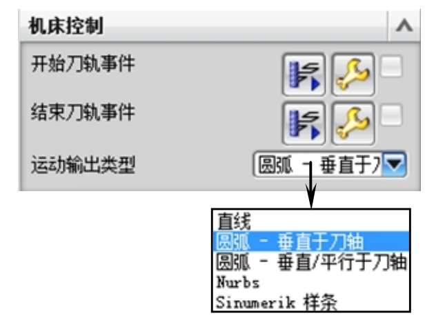 【运动输出类型】选项控制机床的输出状态。其下拉列表中包括直线、圆弧-垂直于刀轴、圆弧-垂直//平行于刀轴和Nurbs选项。