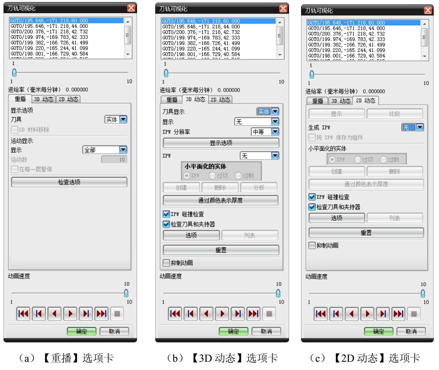 ,弹出【刀轨可视化】对话框,如图1-120所示。对话框中有3个功能选项卡:重播、3D动态和2D动态。