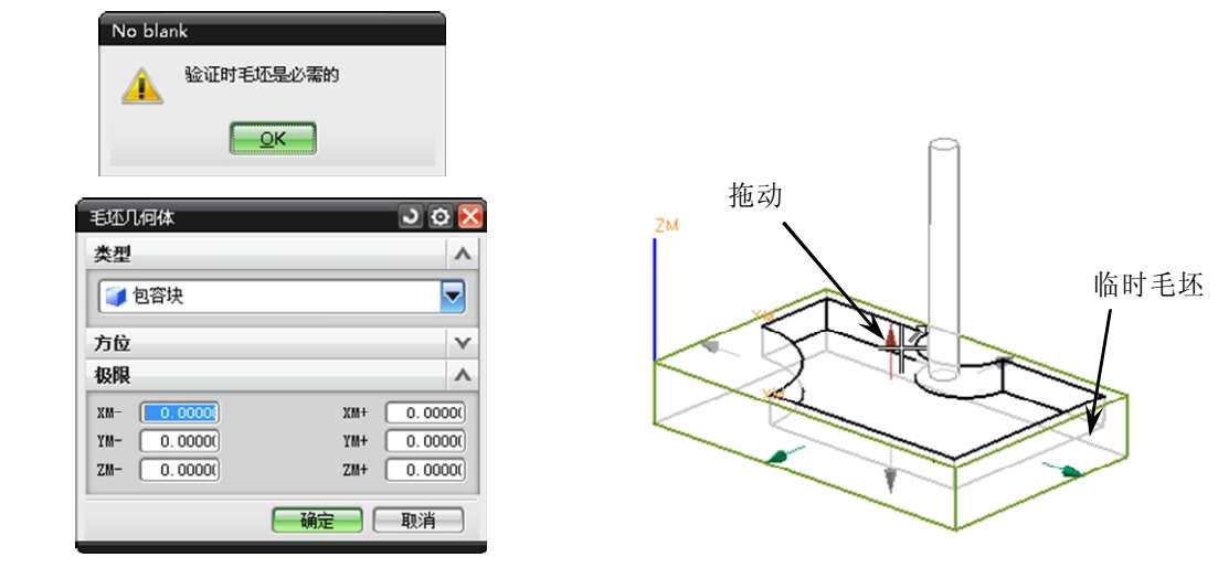 如果表面铣削参数设置时没有指定毛坯,模拟刀路时会弹出【No blank】信息提示框。单击该对话框的【OK】按钮,用户可在弹出的【毛坯内何体】对话框中输入自动块的延伸值,或者在图形中拖动方向箭头,设定一个临时的毛坯几何体供模拟操作时使用,如图1-127所示。