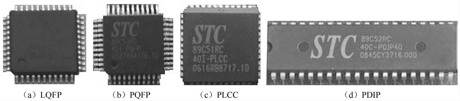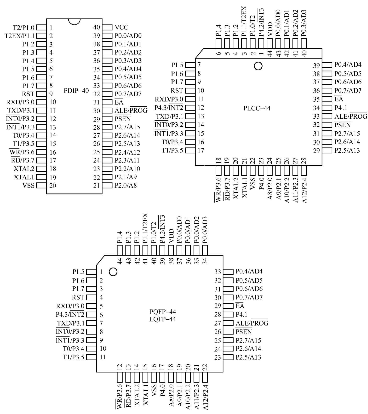 为适应不同产品的需求,STC89系列单片机采用了LQFP—44(Low Quad Flat Package,薄型方块平面封装)、PQFP—44(Plastic Quad Flat Package,塑料方块平面封装)、PLCC—44(Plastic Leaded Chip Carrier)和PDIP—40(Plastic Dual In-line Package,塑料双直列直插式)这4种不同的封装方式,其外形及引脚名称如图1-1所示。4种封装的单片机实物外形如图1-2所示。