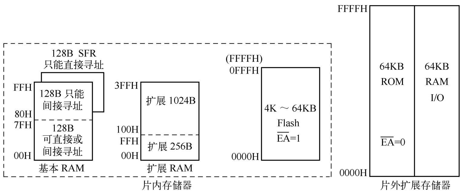 数据存储器RAM是用于存放运算的中间结果、数据暂存、缓冲、标志位、待调试的程序。STC89系列单片机的片内数据存储器又分为片内基本数据存储器(相应于MCS—51单片机的片内数据存储器)和片内扩展数据存储器,其中片内基本数据存储器的存储范围为00H~FFH;片内扩展数据存储器是在片内基本数据存储器的基础上再增加256B/1024B(即实现片内512B或1280B的存储空间),其片内扩展数据存储空间(00H~FF/3FFH);片外数据存储范围为0000H~FFFFH,即片外为64KB。