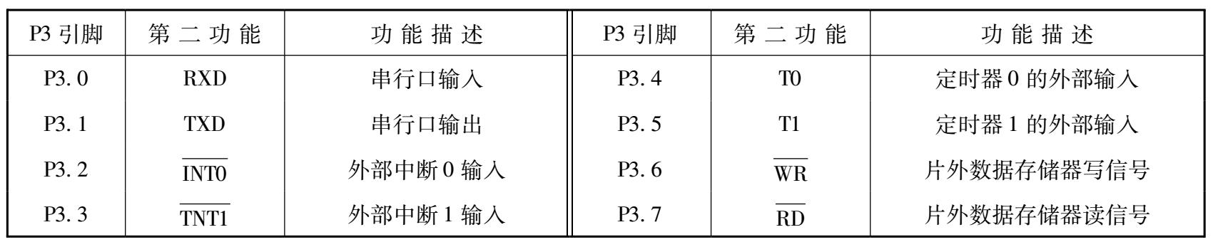 ● P3(P3.0~P3.7):P3端口是一个带内部上拉电阻的8位准双向I/O端口。向P3端口写入1时,P3端口被内部的上拉电阻上拉为高电平,可用做输入口。当作为输入时,被外部拉低的P3端口会因为内部上拉而输出电流。第一功能作为通用I/O端口,第二功能作控制口,见表1-2。P3端口能驱动4个LSTTL(Low-power Schottky TTL)负载。