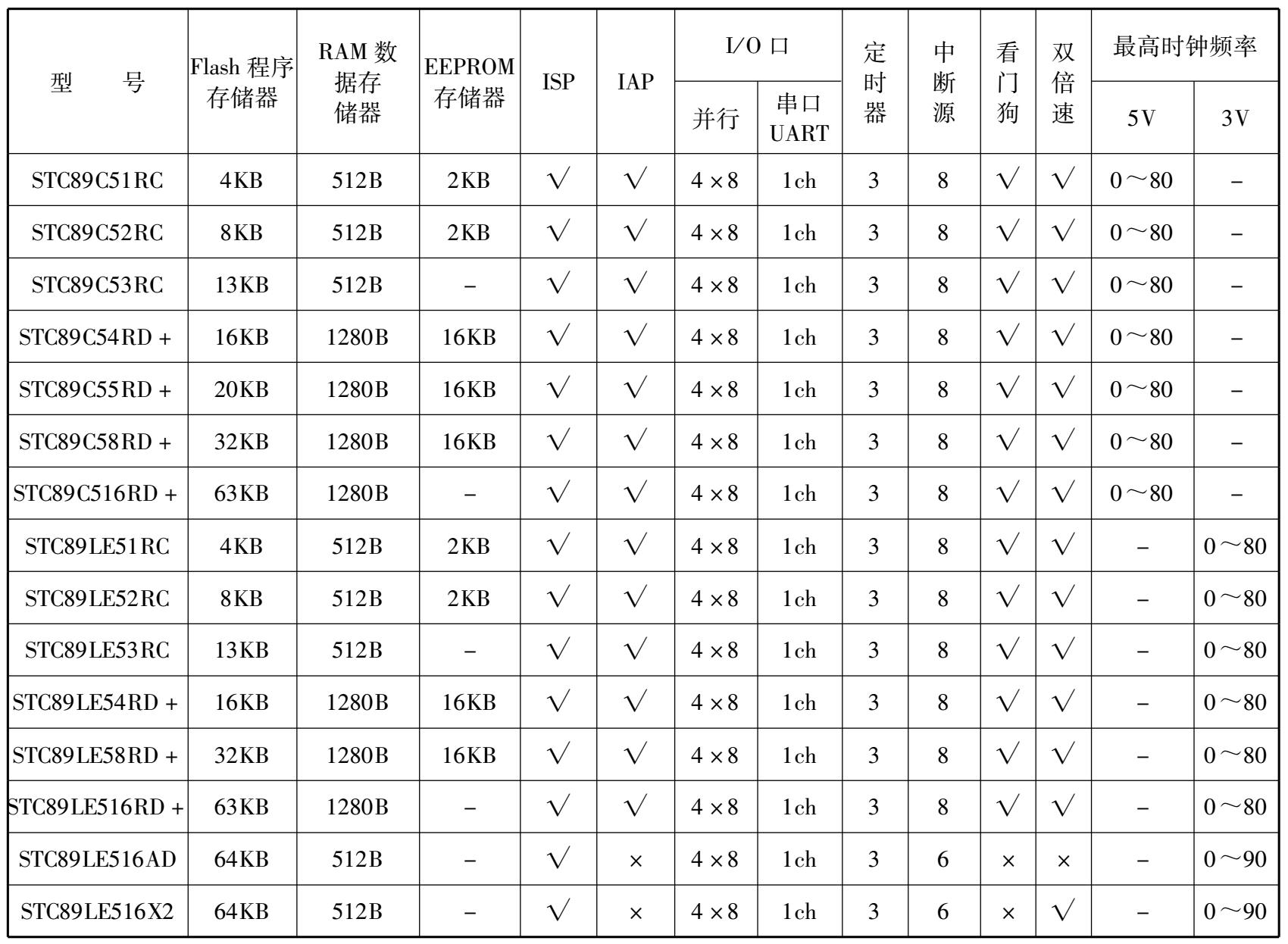 STC89系列单片机分别包含了32条I/O口线、3个16位的定时/计数器、8输入4优先级嵌套中断结构、1个串行I/O口等。表1-1所列为STC89系列单片机的主要性能指标。