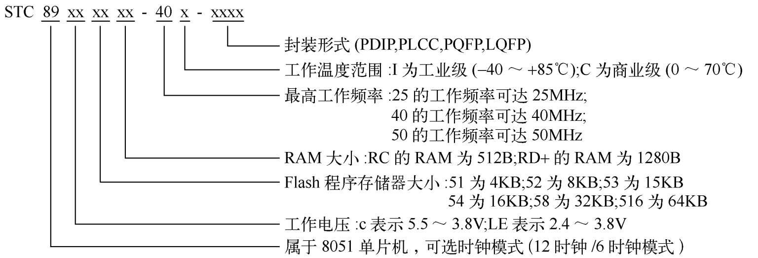 STC89系列单片机有多种型号,每种型号具有一定的含义,以下是其产品命名方法: