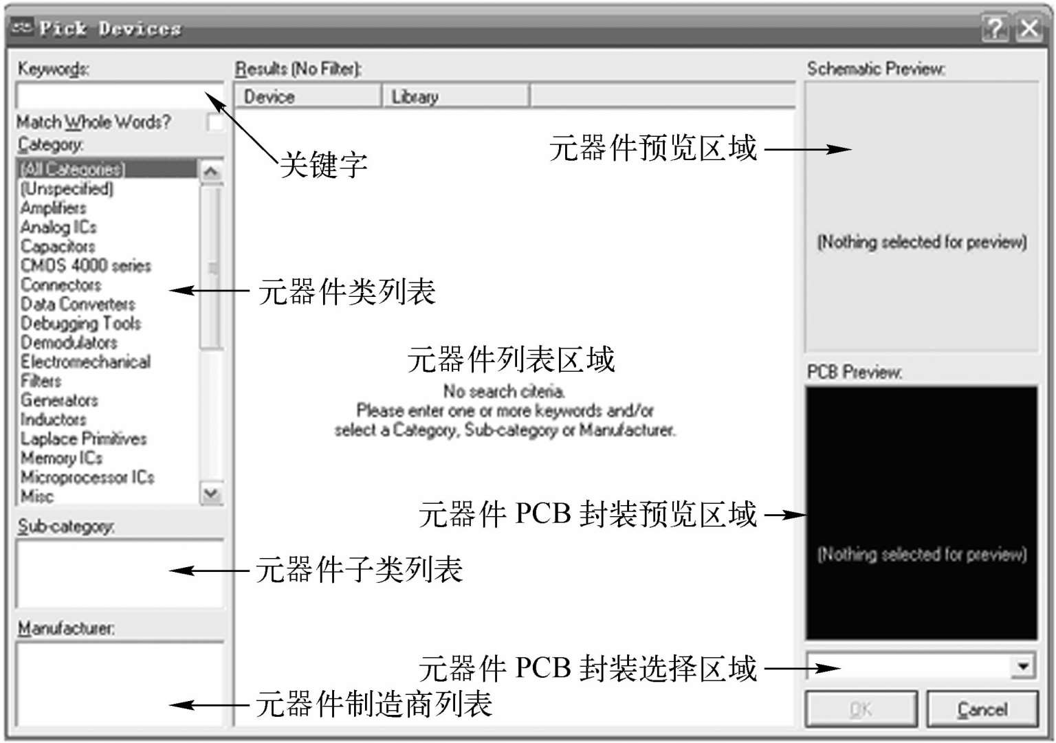 中单击“P”按钮,或者执行菜单命令“Library”→“Pick Device/Symbol”“”,弹出如图2-16所示的Pick Devices对话框。在此对话框中,添加元器件的方法有以下两种。