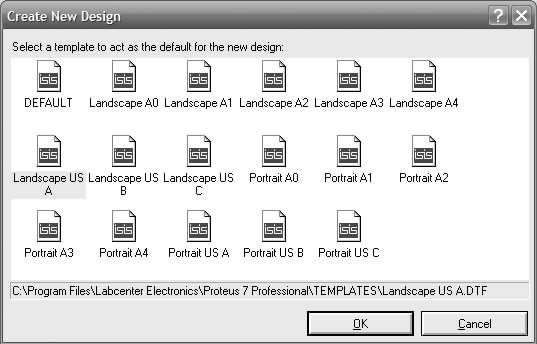 ,打开ISIS 7 Professional窗口。执行菜单命令“File”→“New Design”,弹出如图2-14所示的模板选择窗口。横向图纸为Landscape,纵向图纸为Portrait,DEFAULT为默认模板。选中DEFAULT,单击“OK”按钮,则新建了一个DEFAULT模板。也可以在ISIS 7 Professional窗口中直接单击