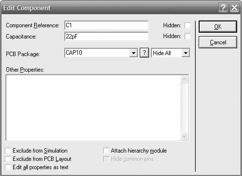 8)设置、修改元器件属性 在需要修改元器件上单击鼠标右键,在弹出的菜单中选择“Edit Properties”,或按快捷键“Ctrl”+“E”,将出现“Edit Component”对话框,在此对话框中可以设置相关信息,如修改电容为22pF,如图2-24所示。