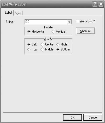 图标,再在总线或各分支线上单击鼠标左键,弹出图2-23所示“EditWireLabel”对话框。在“Label”选项卡的“String”栏中输入相应的线路标号,如总线为AD[0..7](表示有AD0~AD7共8根数据线),分支线为AD0、AD1等。