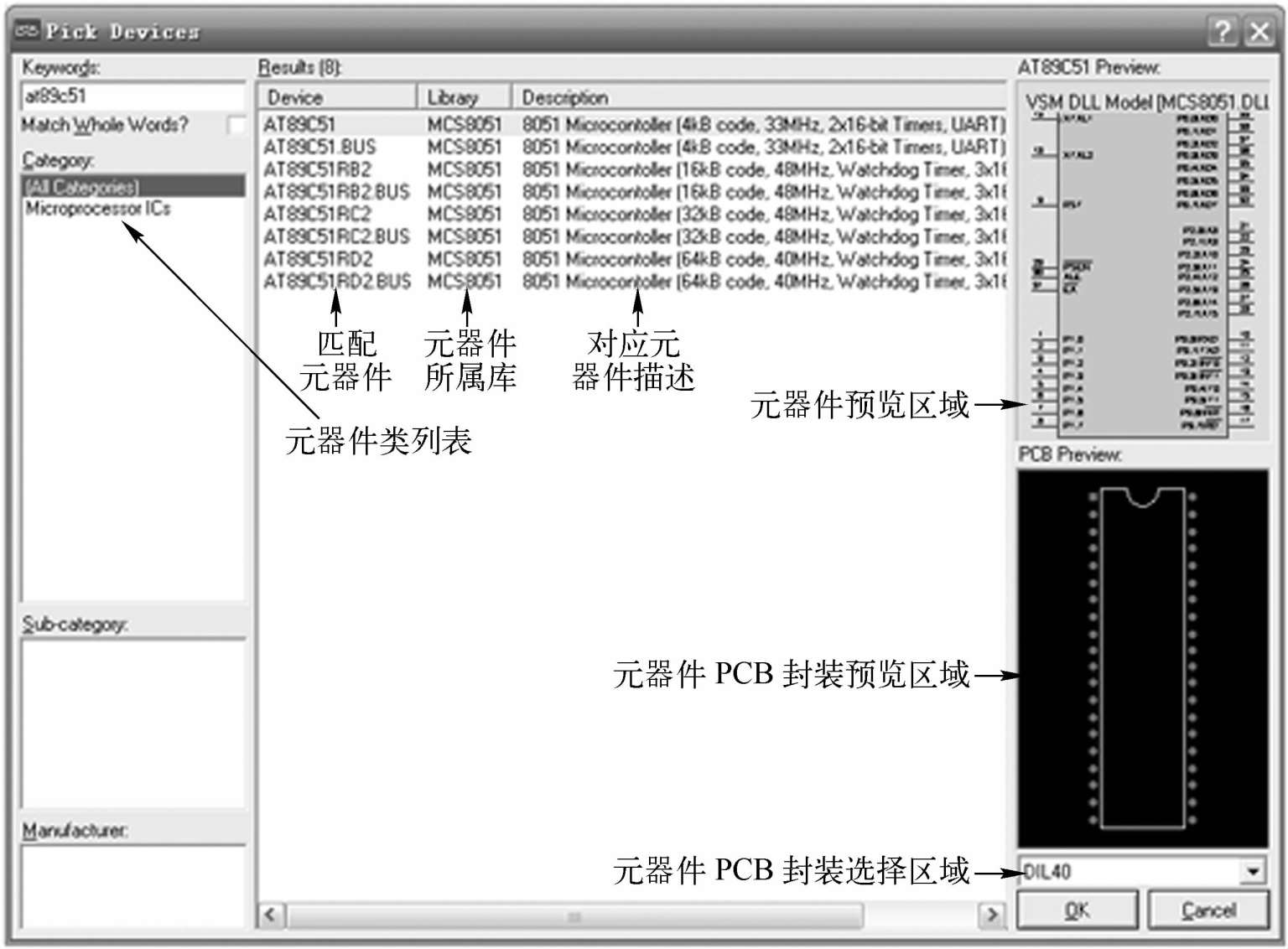 ● 在关键字中输入件元名称,如AT89C51,则出现与关键字匹配的元器件列表,如图2-17所示,选中并双击AT89C51所在行后,单击“OK”按钮或按“Enter”键,便将器件AT89C51加入到ISIS对象选择器中。