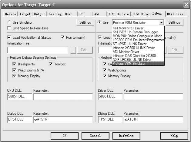 图标,然后在弹出的“Options for Target‘Target1’”对话框中选择“Debug”选项卡,选中右边的“Use”并选择“Proteus VSM Simulator”,如图2-27所示。