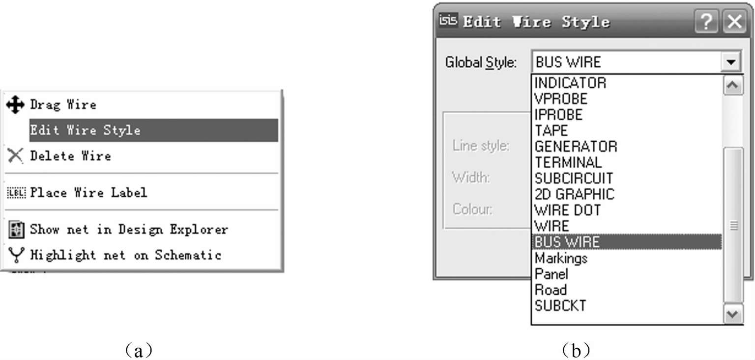 (3)如果该线为单线,要设置为总线时,先选中该线,单击鼠标右键,在弹出菜单中选择“Edit Wire Style”项,如图2-20(a)所示,再在弹出的“Edit Wire Style”对话框的“Global Style”下拉列表中选择“BUS WIRE”,如图2-20(b)所示。绘制的总线如图2-21所示。